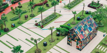 Salah satu keunikan taman ini adalah keberadaan bangunan rumah warna-warni berukuran 5×4 meter yang bisa jadi spot foto instagramable.