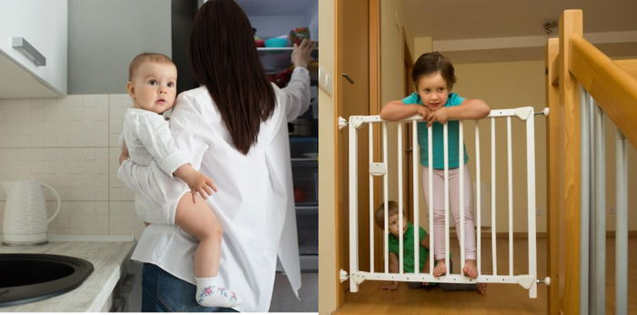 Selain itu, penting untuk menyembunyikan bahan kimia dan benda tajam di rak tinggi di dapur, dan memastikan tempat tidur bayi aman. Karpet juga harus disediakan di dalam ruangan untuk memberikan bantalan jika terjatuh. Langkah-langkah keamanan lainnya termasuk menambahkan pelindung karet ke sudut meja tajam, serta menutup outlet listrik yang terbuka.