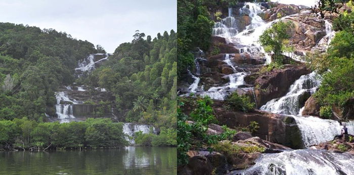 Air terjun yang bermuara di Selat Peniting ini memiliki tujuh tingkatan yang menjadi ciri khasnya. Jika dilihat dari bawah, curahan airnya bak turun dari langit dan sangat indah. Bunyi gemericik airnya sangat menenangkan hati ditambah dengan suasana sekitar yang sejuk.