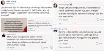 Salah satu topik viral tentang hubungan kekasih yang belakangan jadi perbincangan di Twitter adalah alasan meninggalkan pasangan walaupun sudah menjalin hubungan cukup lama. Twit ini viral setelah diunggah oleh akun @AREAJULID yang menampilkan beberapa cuitan tentang motif dibalik seseorang yang tega mengakhiri hubungannya dengan pasangan.