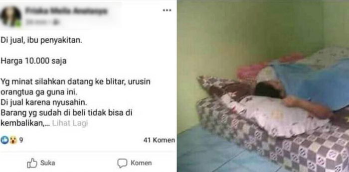 “Dijual ibu penyakitan, harga 10.000 saja, yang minat silakan datang ke Blitar. Urusin orangtua ga guna ini, dijual karena nyusahin, barang yang sudah dibeli tidak bisa dikembalikan,” tulisnya.