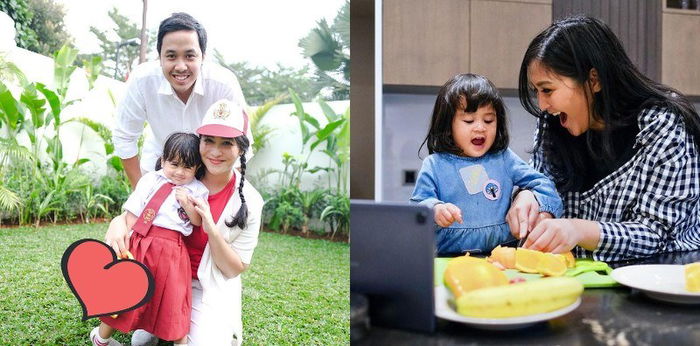 Sepertinya sang Mama sudah tidak sabar lagi melihat putri sulungnya masuk sekolah dasar. Anak perempuan yang juga akrab disapa Mba Shawa itu tampak lucu dan menggemaskan dengan pakaian merah putih anak SD.