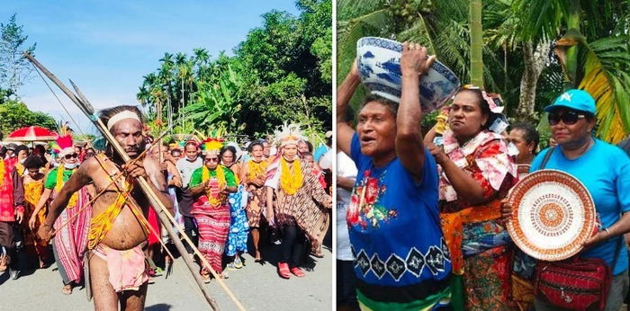 Tradisi ini pun berlangsung cukup meriah. Biasanya diiringi tabuhan Tifa, alat musik khas Papua dengan membawa piring gantung di atas kepala.