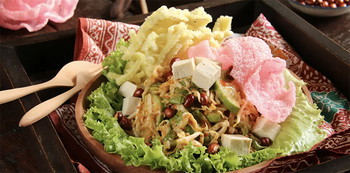 Dalam satu porsinya berisi kubis, timun, kacang tanah, irisan bengkoang, dan kerupuk mie. Kuah sambal kacangnya encer dan bisa request tingkat pedasnya, ditambah juga gula merah cair buat seimbangkan rasa pedas.
