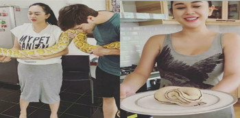 Tak hanya itu, terdapat juga video yang memperlihatkan Aura sedang mengalungkan seekor ular tepat di lehernya. Ular ini memang tidak lebih besar daripada ular yang digendong oleh Aura dan suami.