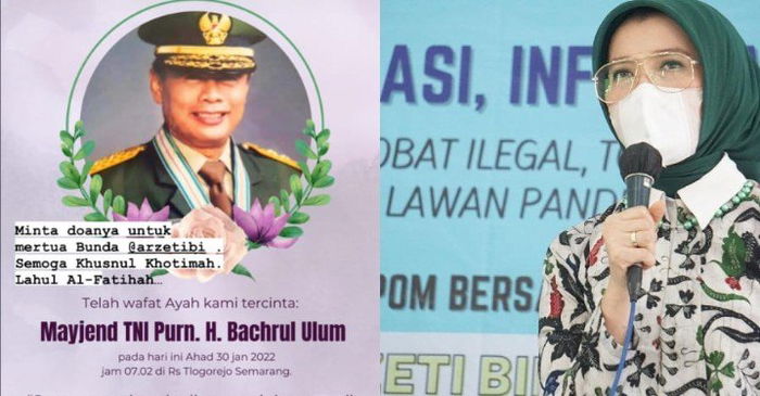 Kabar duka menyelimuti dunia hiburan tanah air. Ayah mertua Arzeti Bilbina meninggal dunia pada Minggu (30/1/2022). Kabar meninggalnya Mayjen TNI Purn. H. Bachrul Ulum pertama kali dibagikan oleh akun Instagram @sahabat_arzeti dalam unggahan Instagram Stories.