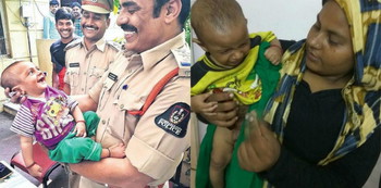 Inspektur R. Sanjay Kumar dari Kantor Polisi Nampally menggendong Faizan yang berusia 4 bulan. Mereka saling bertukar senyum bahagia karena berhasil mengalahkan penculik yang terlibat dalam perdagangan manusia.