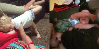 Mungkin ini sering dilakukan oleh anak yang menginjak usia balita. Anak ini melakukan gerakan seperti pose yoga triangle dengan mulut yang tidak mau lepas dari puting sang ibu. Lucunya ya, Bun!