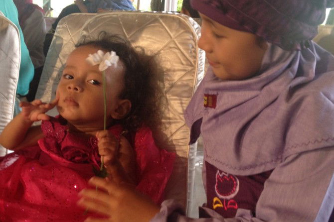 Anak-anakku pun terlihat senang bermain dengan tante kecilnya. Meskipun mereka tak bermain lari-larian atau melompat seperti permainan anak-anak lainnya, tetapi mereka tetap bergembira saat menonton film kartun bersama, atau bermain boneka, atau bermain lilin.