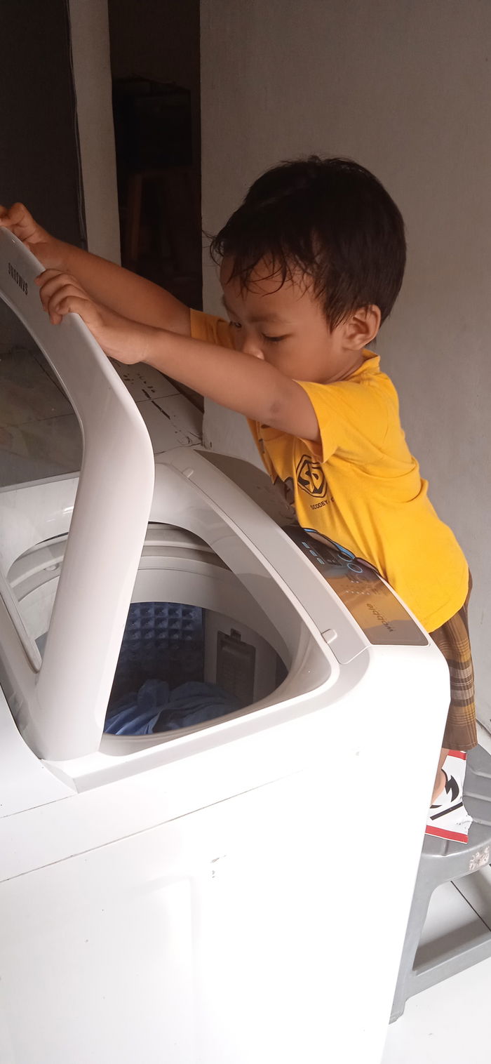 Akhirnya aku ajak dia cuci baju sekalian biar dia juga belajar gimana caranya baju kotor bisa jadi bersih dan wangi lagi. Keliatan sepele sih, tapi ini juga bisa sekalian melatih sensorik dan motoriknya ya moms. Mulai dia dari masukin baju ke dalam mesin cuci, pencet tombol sesuai arahan aku, sampai proses menjemur baju.