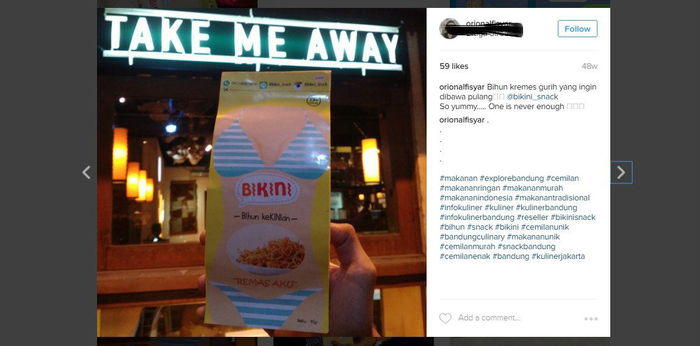 Makanan yang dijual secara online di media sosial Instagram ini, memiliki nama bikini snack. Dimana merek makanan tersebut menjual mi bihun kekinian. Yang kemudian populer, sebab memiliki merek dagang yang berbeda. Lantas saja jajanan yang dijual dengan harga 15 ribu rupiah tersebut, memancing kontroversi di media sosial. Lantaran camilan tersebut dinilai porno oleh banyak pihak. Apalagi, makanan tersebut bisa saja menjadi kegemaran anak anak.