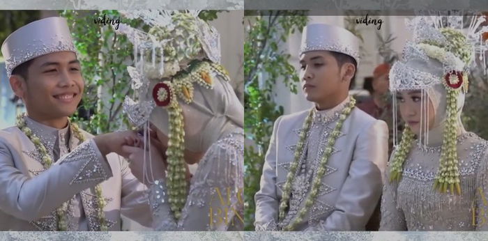 Bintang dan Alca mengenakan busana berwarna perak. Mempelai perempuan tampak begitu cantik mengenakan aksesoris kepala khas Betawi. Keduanya tampak begitu serasi saat duduk berdampingan.