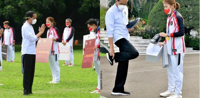 Ada yang unik dalam momen penyerahan bonus atlet di Istana Kepresidenan hari ini. Yakni peraih medali emas ganda putri bulutangkis, Greysia Polii yang membawakan sepatu sneakers pesanan sang presiden.