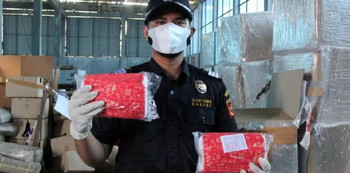 Seorang petugas otoritas kepabeanan memperlihatkan bungkus plastik berisi masker buatan China yang diselundupkan dari Malaysia, di Kantor Bea dan Cukai Dumai di Dumai, Riau, Jumat (22/1/2021) (Foto: ANTARA)