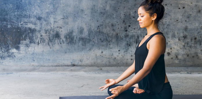 Anda bisa duduk di atas matras yoga. Pastikan ruangan tenang dan nyaman. Apabila perlu, Anda juga bisa tambahkan pengharum atau audio menenangkan seperti suara burung berkicau dan air mengalir.