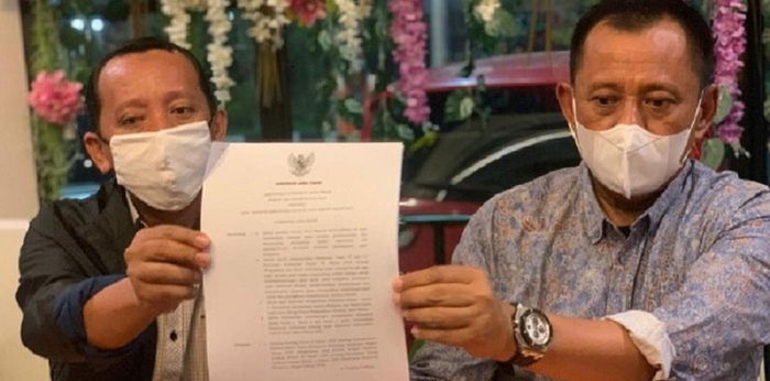 Foto: Sekdaprov dan Ketua Dewan Pengupahan Jatim menunjukkan surat penetapan UMK (Foto: Detik/Faiq Azmi)