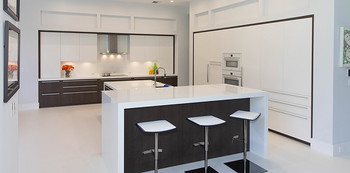 Terang dan cerah, desain dapur ini memiliki keseimbangan sempurna antara permukaan putih besar yang kontras dengan lemari kayu gelap. Dapurnya mengarah ke teras yang dipisahkan dengan pintu kaca besar untuk lebih membawa suasana alam bebas ke dalam ruangan dapur.
