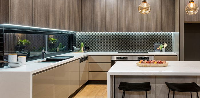 Desain dapur leter L contohnya yang bisa membuat ruang dapur Anda sekaligus menjadi tempat makan keluarga. Padukan dengan warna hangat seperti material kayu yang lembut dengan abu-abu muda.