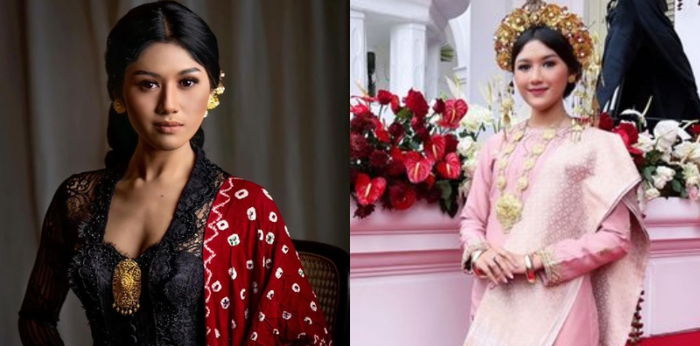 Seperti yang terlihat dalam potret tersebut, terlihat kebaya hitam ungu yang dikenakan oleh Erina itu dirancang dengan gaya modern serta dipadukan dengan rok batik yang memiliki potongan cukup tinggi di bagian depan.