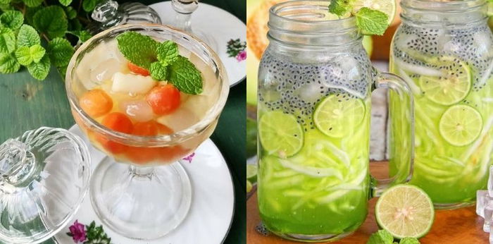- Campurkan timun serut, selasih, nata de coco, sirup gula, sirup melon, perasan jeruk nipis, dan iar.