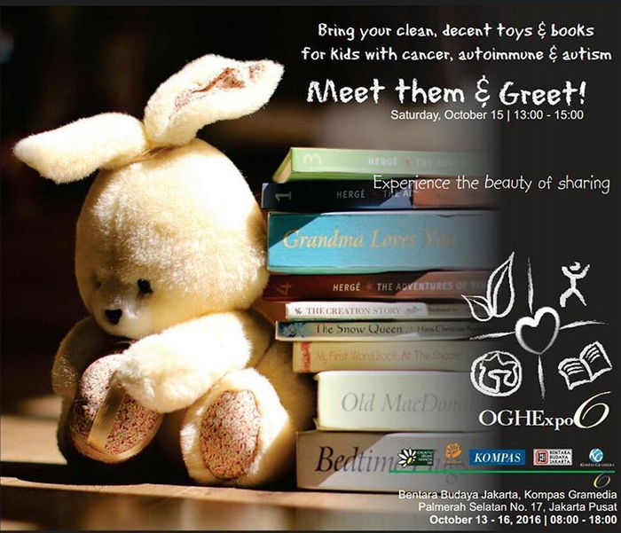 Saatnya ajari si kecil untuk berbagi dengan sesama. Bawa mainan dan buku Anda di acara Meet them and Greet bersama anak-anak kanker, autoimun, dan autis. Acaranya ada di Bentara Budaya di Gedung Kompas Gramedia Jakarta. Tanggal 15 Otober 2016 pukul 13.00-q5.00 WIB.