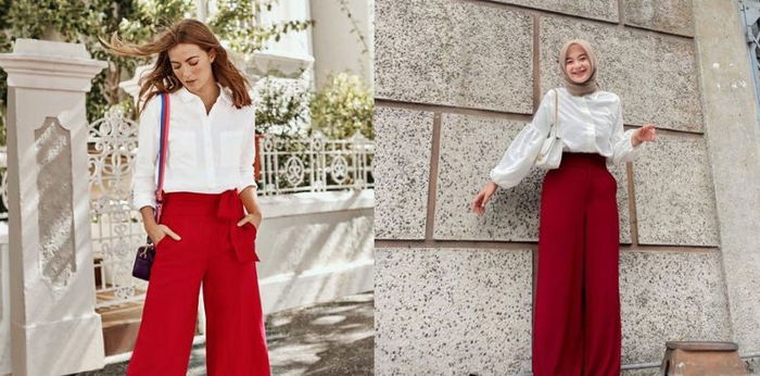 Agar memberikan kesan merah putih yang khas akan warna Tanah Air, Anda bisa mencoba menggabungkan dalaman kaus dan celana kulot berwarna putih, kemudian memadukannya dengan kemeja berwarna merah sebagai luaran.