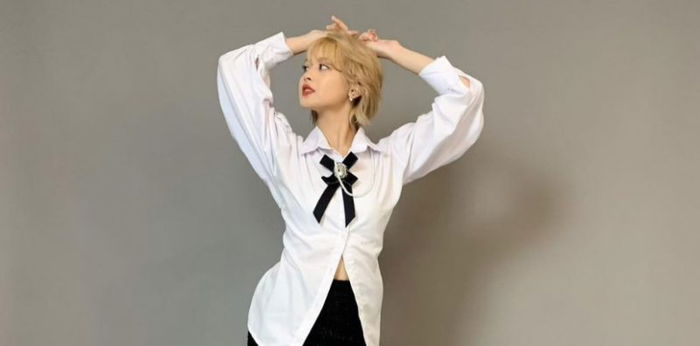 Penampilan mengenakan kemeja putih dengan dasi pita hitam yang dipadankan dengan rok mini dan boots berwarna senada, membuat konsep monokrom yang lebih elegan dan berkelas.