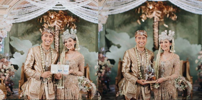 Sheila Dara yang dandan menjadi pengantin adat Sunda Siger begitu manis bersanding dengan pelantun “Nuansa Bening” itu. Mereka pun pamer cincin kawin dan buku nikah.