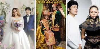 Atta mengenakan setelan jas dan bawahan berwarna putih. Aurel terlihat cantik sekali dengan rambut tergerai panjang. Ia juga mengenakan gaun pengantin berekor panjang dan motif bunga yang warnanya senada setelan Atta.