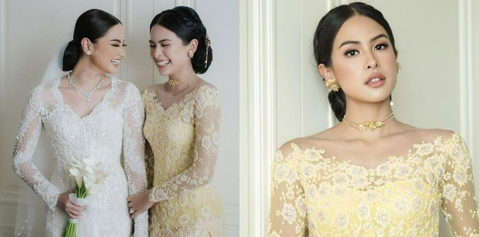 Di hari bahagia sang adik, Maudy Ayunda tampil anggun dan menawan dengan mengenakan kebaya berwarna baby yellow rancangan desainer Tanah Air, Didiet Maulana. Kebaya yang dikenakan tersebut merupakan kebaya khas Melayu off-shoulder dengan sentuhan kristal dan bordir bunga-bunga halus.