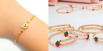 Gelang emas untuk anak perempuan yang satu ini cocok untuk Bunda yang menyukai perhiasan sederhana, tetapi tetap terlihat manis. Hiasan bergambar stroberi berukuran kecil di ujung-ujungnya, membuat tampilan gelang terlihat manis dan tidak mencolok.