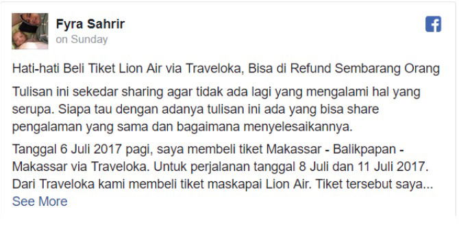 Seorang pengguna Facebook dengan nama akun Fyra Sahrir mengungkapkan kekesalan lewat statusnya kepada maskapai penerbangan dan jasa travel penjual tiket. Ia bercerita bahwa orangtuanya batal hadiri resepsi pernikahan di Samarinda karena kesalahan Traveloka dan Lion Air.
