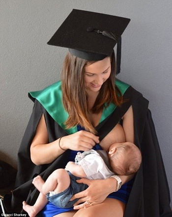 Jacci Sharkey menjadi bintang utama dari sebuah foto yang menggambarkan sisi keindahan seorang ibu. Dalam foto tersebut Jacci, 24 tahun, berpose menyusui bayinya yang berusia 6 minggu dalam pakaian wisuda, lengkap dengan topi toganya.