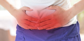 - Sumbatan (inkarserasi), di mana sebagian usus ‘terjebak’ pada kanalis inguinalis dan menyebabkan mual, muntah, nyeri perut, serta nyeri pada benjolan yang timbul. Benjolan pada hernia yang mengalami inkarserasi tidak dapat didorong atau dimasukkan kembali.