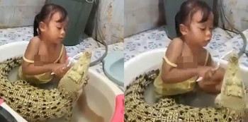 Dalam video yang viral tersebut, gadis kecil itu terlihat mengenakan pakaian renang berwarna kuning, sedang duduk ditemani oleh seekor buaya di dalam bak mandi anak-anak.