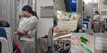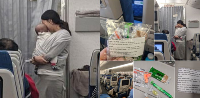 Oleh karena itu, dia memutuskan untuk membagikan 200 kantung yang berisi berbagai jenis permen, penutup telinga, dan sebuah pesan kepada penumpang. Aksi ini dilakukannya untuk berjaga-jaga jika bayinya mulai menangis dalam penerbangan selama 10 jam.