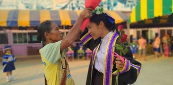 Akhirnya yang dinanti pun tiba. Seorang anak gadis memakai toga berhambur mendatanginya sambil menyungging senyum di wajah. Dengan semringah si ibu sederhana itu menyematkan bunga di kepala putrinya.