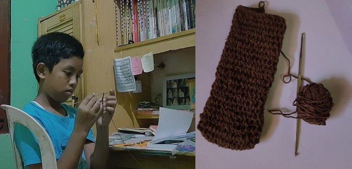 Akun @trianovandaptr mengunggah foto Tama yang tengah asik merajut dan juga hasil karya rajutannya. Dia mengisahkan kesedihan sang keponakan setelah dimarahi oleh ibunya hanya karena hobinya itu.
