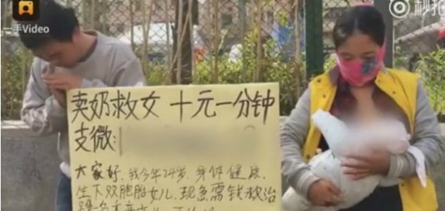 Seperti yang dikutip dari laman BBC, sebuah video yang diunggah di situs video Miaopai memperlihatkan seorang ibu muda yang menjual ASI miliknya. Menyadari kalau biaya pengobatan tidak sedikit, ia bersama sang suami melakukan aksi penggalangan dana di pinggir jalan sambil membawa spanduk.