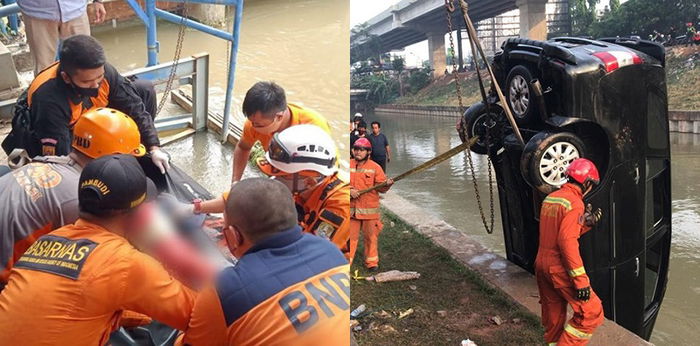 Dengan kecepatan tinggi, saat hendak berbelok, sang supir bukannya mengerem malah menginjak gas sehingga mobil itu langsung meluncur masuk ke Sungai Kalimalang.