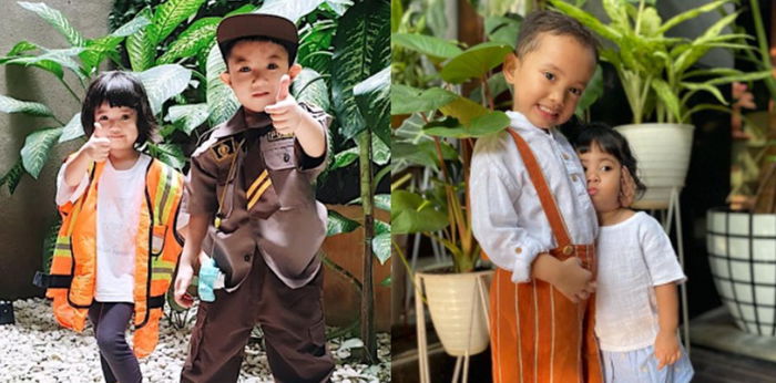 Anak pertama yang dipanggil Uta mengenakan seragam polisi, sementara anak keduanya yang dipanggil Uti mengenakan seragam kontraktor.