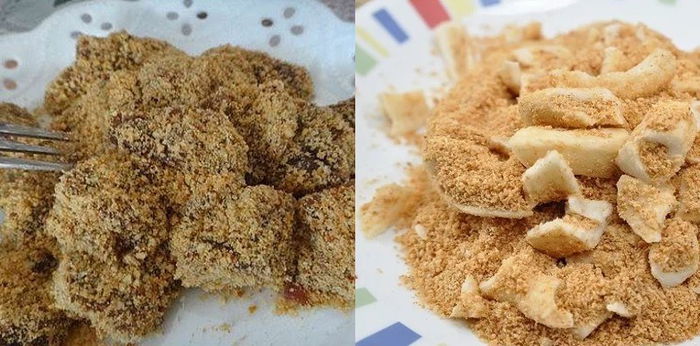 - Ambil adonan kaloci secukupnya dan taruh di atas campuran kacang. Potong-potong (sesuai selera) adonan kaloci sambil digulingkan ke campuran kacang hingga rata.