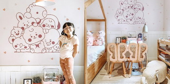Dengan wallpaper berdesain karakter BT21, kamar Gempi ini juga menyuguhkan nuansa kamar yang sangat menarik dengan perpaduan antara warna pastel dan aksen kayu. Parents bisa saksikan bagaimana konsep interior yang dikemas dengan kombinasi yang memanjakan mata anak-anak masa kini.