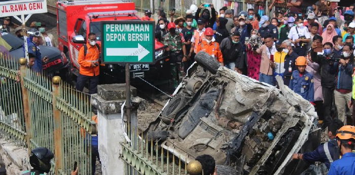 Evakuasi langsung dilakukan oleh dilakukan Dinas Pemadam Kebakaran dan Penyelamatan Kota Depok bersama PT KAI dan masih berlangsung sekitar pukul pukul 09.25 WIB. Petugas berusaha menarik kendaraan menggunakan tali pengikat di mobil pemadam.