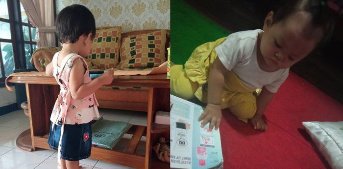 Saya bahkan memberikan majalah lama atau buku apapun yang boleh ia robek atau coret, karena harga buku bayi relatif mahal menurut saya sehingga saya hanya memanfaatkan secara maksimal hal yang ada saja.