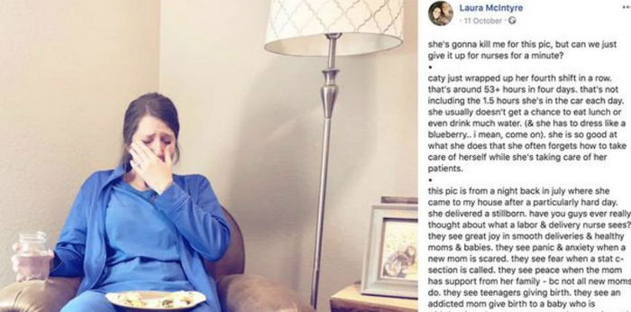 Dalam foto tersebut, Caty yang merupakan seorang perawat persalinan di Medical City McKinney, Texas, terlihat tengah terduduk di sebuah kursi. Ia tampak sedang menangis dengan sepiring makanan di pangguannya dan minuman di tangannya.