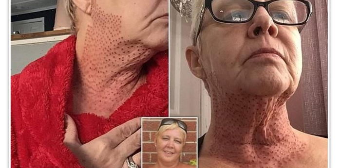 Gara gara ingin kencangkan kulit untuk mengurangi double chinya, Seorang wanita asal Inggris bernama Jayne Bowman (59) harus mengalami reaksi buruk di lehernya berupa bintik-bintik merah.