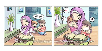 Pada komik yang kedua juga terlihat ilustrasi yang menggambarkan kehidupan sehari hari keluarga muslim. Tokoh ibu pada komik tersebut terlihat menyuruh anaknya mengaji. Namun kedua anaknya tidak menghiraukan hal tersebut. Mereka justru tetap bermain dan membuat sang ibu merasa bersedih melihat ulah kedua anaknya. Pada komik tersebut juga digambarkan sang ibu sampai menangis melihat sikap buah hatinya.