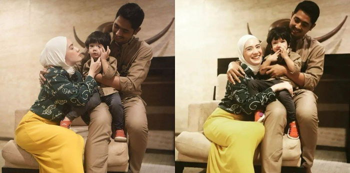 Di potret lainnya, masih berpose bertiga, senyum bahagia terpancar dari wajah ketiganya.Dalam foto tersebut Arya tertawa bahagia saat memangku putranya, Ibrahim. Sedangkan istrinya tersenyum dengan gaya memeluk buah hatinya itu.