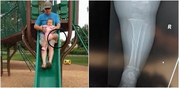 Ketika mereka menuruni seluncuran, sepatu tersebut ternyata membuat kakinya terjepit di antara kaki ayahnya dan tepi perosotan. Setelah mencari bantuan medis, dokter mengatakan bahwa bahwa Emelyn menderita fraktur spiral pada kakinya. Emelyn harus segera dibawa ke dokter ortopedi anak untuk mendapatkan gips.